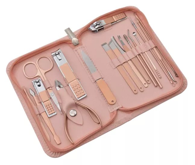 KIT MANUCURE ET PÉDICURE 18PCS EN ACIER INOXYDABLE AVEC ÉTUI ROSE
